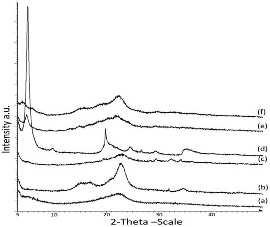 X-ray diffraction (XRD) patterns of (a) matrix κ-carrageenan; (b) CNC powder; (c) κ-carr/CNC bionanocomposite film; (d) OMMT powder; (e) κ-carr/OMMT bionanocomposite film; and (f) hybrid κ-carr/CNC/OMMT bionanocomposite film.