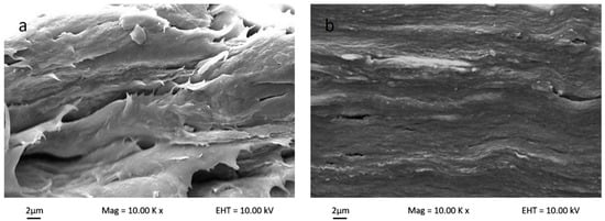 The tensile strength of the κ-carr bionanocomposite films with the addition of CNCs (κ-carr/CNCs) and OMMT (κ-carr/OMMT) was determined (Figure 1a). κ-carr/CNCs and κ-carr/OMMT exhibit a higher tensile strength compared with the matrix κ-carr film, which possesses the lowest tensile strength (23.4 MPa). The tensile strength increases with increasing CNCs and OMMT filler loading, with the optimum loading determined to be 4% for each filler type. The κ-carr bionanocomposite film at 4% CNCs and OMMT loading exhibit optimum tensile strengths of 39.1 and 51.8 MPa, respectively. The significant improvement for the κ-carr/CNCs is primarily owing to the CNCs’ high aspect ratio along with the large surface area, resulting in a strong interfacial interaction between the CNC and matrix providing improved reinforcement capability, which relocates the effective stress transfer to the CNC-matrix interface. Moreover, their similar polysaccharide structures form a CNCs homogeneous dispersion in the matrix phase, which is reflected in the strong adhesion between matrix and filler. The significantly improved mechanical properties are attributed to the similarity in chemical structure between κ-carrageenan and CNC, which causes a strong interaction between the κ-carrageenan matrix phases and CNC nanofillers with interfacial hydrogen interaction. This interaction, along with the inherent properties of CNCs, including high surface area and high crystallinity, increase the surface interaction [4,20].