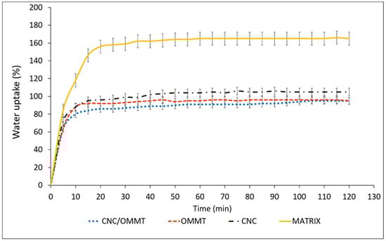 Figure 8 shows the effects of optimum filler loading (4%) of OMMT and CNCs effects on water uptake of the κ-carr-based film. Reducing biopolymer water sensitivity and enhancing its water resistance are significantly important because the bionanocomposite performance is enhanced. CNC incorporation significantly reduces the κ-carr-based films’ water uptake percentage. After 2 h immersion in water, the water uptake of the control κ-carr film was 166%. The incorporation of CNCs at 4% filler loading leads to a reduction in water uptake to only 105%. Haq et al. [36] have also reported that a low nanocellulose content led to slower diffusion processes as evidenced by the composite films’ increased tortuosities. Even though both the κ-carr matrix and CNCs are considered to be hydrophilic, the barrier to water permeability is enhanced due to the high crystallinity of the CNCs filler added to the bionanocomposite and is related to strong hydrogen bonding between the hydroxyl groups of the nanoparticles and κ-carr [33]. These interactions improve the cohesiveness of the κ-carr polymer matrix and enhance its resistance to water, as water molecules are not able to sufficiently break these strong bonds [28]. The results demonstrate that nanocellulose efficiently improves barrier properties through network formation [Figure 6b] in the polymer matrix that can reduce water absorption.
