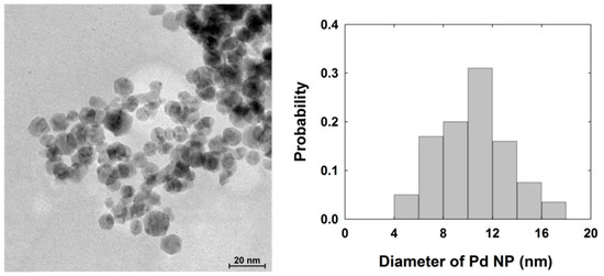 The size of Pd nanoparticles (NPs) was determined by acquiring TEM images as shown in Figure 1. The average diameter of Pd NPs was approximately 11 (±3) nm. The concentration of stock solution of Pd NPs was calculated from the concentration of the Pd precursor divided by the average number of Pd atoms contained in a particle. The average number of Pd atoms in a 11 nm sized Pd NP was estimated as ~4.74 × 104 atoms. The average number of atoms per particle was calculated by the proportional basis of density and radius between single atom and NP.