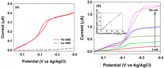 Cyclic voltammograms of hydrogen peroxide reduction reaction at: (a) Au (black dashed) or Pd (red solid) ultramicroelectrode (UME) (radius 6.35 and 10 µm, respectively) in a 0.1 M phosphate buffer (PB) solution (pH 6.8) containing 20 mM H2O2; (b) Pd UME in 0.1 M PB solution (pH 6.8) containing 0, 10, 20, 30, 50, and 100 mM H2O2. Scan rate was 100 mV/s.