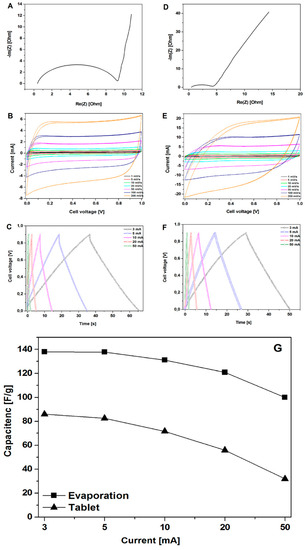 The Nyquist plots, CV, and GCD curves of the electrodes prepared by evaporation (A–C) and pellet formation (D–F) along with the measured specific capacitance (calculated from the GCD curves) for the electrodes prepared by evaporation and pellet formation (G).