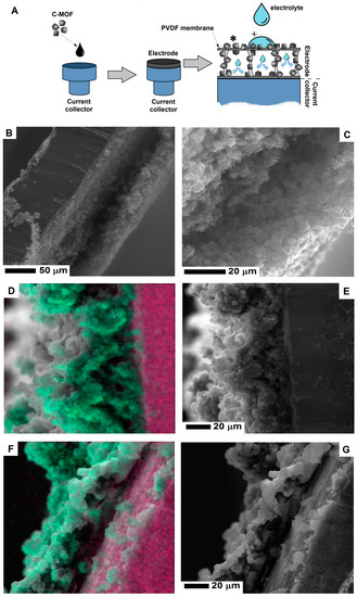 The scheme (A) of the electrolyte penetration of electrode and the SEM images of the electrode cross-section before (B,C) and after electrolyte penetration (D,E and F,G). The image in Figure 5D,F show the SEM images with a merge signal from potassium (green) and copper (pink) (To interpret the colors in this figure, the reader is referred to the web version of this article). The experiment scheme shows the spots of elemental mapping presented in Figure 5D,F, marked with (*) and (+) respectively.