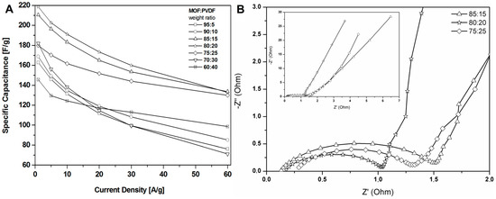 The specific capacitance curves (A) and Nyquist plots (B) of the electrodes prepared by evaporation with different ratios MOF:PVDF.