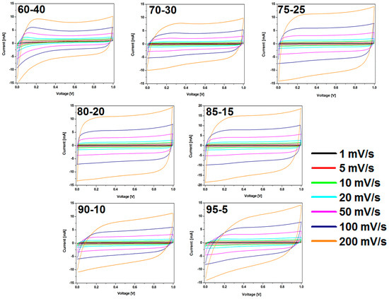 No significant changes were observed in the cross-section of the electrodes with the ratio from 95:5 to 75:25. With the higher content of the polymer binder (30% and 40%) the structures typical for the polymer membrane started to appear (they were formed during the evaporation of dissolved PVDF). The pore structures that allowed for the direct contact of the electrolyte with the current collector were observed in the SEM images. The comparison of SEM images is presented in Figure 10.