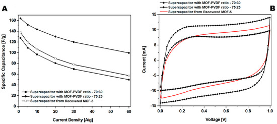 A great increase in recovering and recycling valuable metals (such as Ni, Co, and Li) [31,32,33,34] and carbon nanomaterials (graphene) [35] from spent electrodes from supercapacitors and batteries is observed. In this contribution, the electrode was prepared with recovered CMOF-5 from previously used electrodes in the weight ratio active material:binder equal 80:20 wt%. The CV hysteresis loop and galvanostatic charge–discharge curves curves are presented in the Figure 11A,B, respectively. The capacitance was lower than the electrode with pristine CMOF-5 (Figure 11D). Additionally, compression of the CV hysteresis loop obtained at a scan rate of 200 mV/s shows characteristic deformations (Figure 11C).