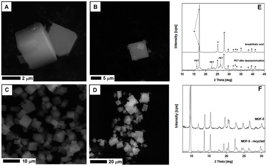 The SEM images of MOF-5 synthesized from fresh substrates (A,B), recycled DMF and terephthalic acid (C,D). The XRD spectrum of the terephthalic acid and depolymerized PET (E), and MOF-5 from unreacted and recycled substrates (F).