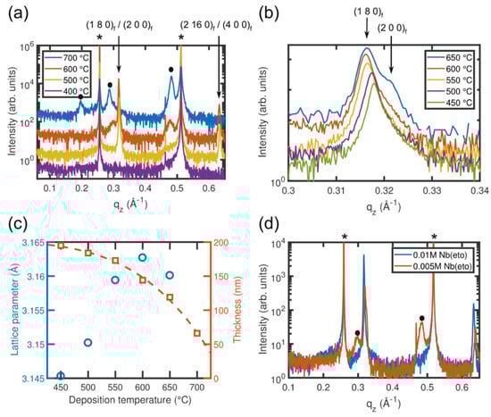 Initially, Nb2O5 films were grown on (100)s SrTiO3 substrates employing substrate temperatures between 400 °C and 750 °C with intervals of 50 °C in order to assess the growth window. Figure 2a shows the wide-range HRXRD profiles of films grown at temperatures of 400 °C, 500 °C, 600 °C, and 700 °C that capture the most important observations. All diffraction patterns contain sharp peaks at approximately 0.255 Å−1 and 0.51 Å−1 that belong to the (100)s and (200)s diffraction peaks of the SrTiO3 substrate, respectively (marked with an asterisk). The small peak observed at 0.46 Å−1 is a measurement artifact caused by Cu Kß radiation. The other Bragg peaks, which are visible in Figure 2a, are attributed to the niobium oxide films. Significant differences can be seen between the diffraction profiles of films grown at different temperatures.