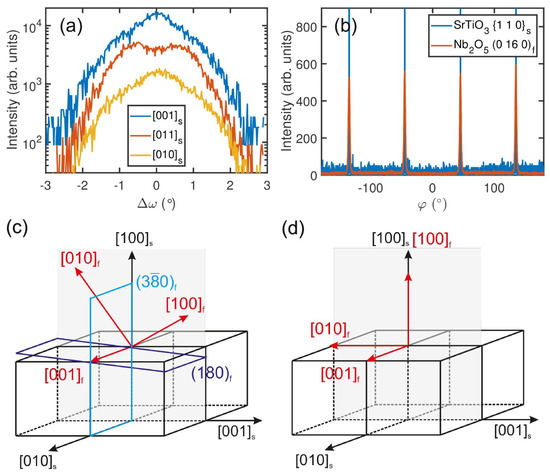 In order to understand these observations, the lattice mismatch between the T-Nb2O5 structure and (100)s SrTiO3 surface has to be considered. While the dimensions of the surface unit cell of (100)s SrTiO3 is given by 3.905 Å × 3.905 Å, the bulk lattice parameters of the orthorhombic T-Nb2O5 polymorph amount to a = 6.168 Å, b = 29.312 Å, and c = 3.938 Å [2]. According to the XRD data (Figure 2b), the films contain (200)f- and (180)f-oriented domains. For both orientations, the c-lattice parameter of T-Nb2O5 can be aligned with one in-plane direction of the (100)s SrTiO3 substrate, either along ±[010]s or ±[001]s. A schematic displaying both configurations of the crystallographic arrangement is given in Figure 4c,d. This epitaxial alignment results in a lattice mismatch of only −0.8% in the c-direction and is, therefore, expected to be energetically favorable. Since all in-plane variants are equivalent, there are four different in-plane orientations for the domains. This theoretical assumption of the presence of four different in-plane variants with (180)f orientation is in good agreement with the ω- and φ-scans that were performed on the (180)f and (0 16 0)f diffraction peaks, i.e., Figure 4a,b.