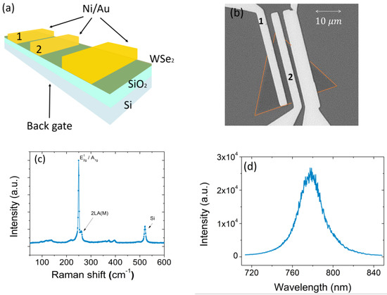 Raman and photoluminescence (PL) spectra were acquired using a WITec Alpha 300 tool (WITec GmbH, Ulm, Germany) with a 532 nm excitation laser. The Raman spectrum of the , displayed in Figure 1c, exhibits two peaks around and , corresponding to an overlapping contribution from the in-plane vibrations of W and Se atoms (E12g) and out-of-plane vibrations of Se atoms (A1g), and to a second-order resonant Raman mode due to LA phonons at the M point in the Brillouin zone [42,43], respectively. The peak frequency positions are typical of a monolayer of thickness [29]. The monolayer structure of the flake is further confirmed by the PL spectrum of Figure 1d, which shows an intense and narrow peak with maximum at and FWHM of Such a peak corresponds to a bandgap of , a value closer to that of a monolayer than to that of a bilayer. Hence, both Raman and PL spectra indicate that the flake is a monolayer.