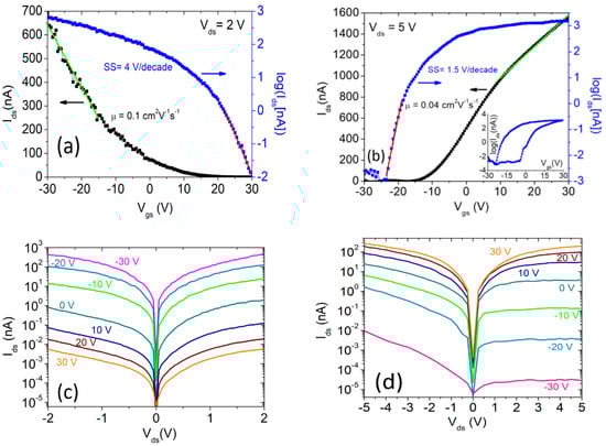 The corresponding output characteristics are reported in Figure 2c,d. Both plots show non-linear behavior for the device in the on state with increasing positive-negative asymmetry when the device approaches the off state. This points to the presence of Schottky barriers at the contacts, possibly with slightly different heights [37,50].