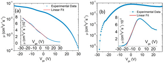 By neglecting the dependence of the mobility, as is usually done in the literature, can be obtained by fitting a straight line to the transfer characteristics, as shown in Figure 2a,b.