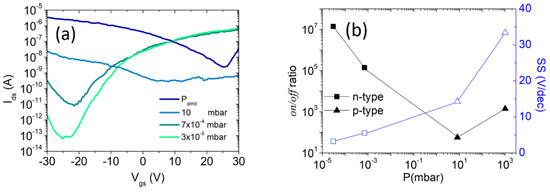 After the removal of the polymeric film and exposure of the device to air for a few days, we observed a restoration of a prevailing p-type behavior due to and water adsorption on the surface and possible depinning of the Fermi level. We then studied the effect of dynamic pressure by increasing the vacuum level of the probe station chamber from atmosphere () to . As reported in Figure 4a, the transistor transfer characteristic changed again from p- to n-type with a gradual decrease of the subthreshold swing and an increase of the on/off ratio, as shown in Figure 4b. We attribute the polarity change to the desorption of adsorbed and to the consequent possible pinning of the Fermi level close to the minimum of the conduction band.