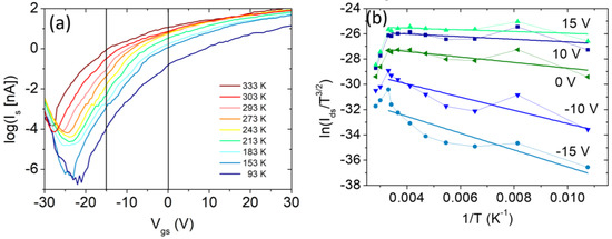 We extract the Schottky barrier at the flat-band condition from a plot of the Schottky barrier height as a function of for the device at a source-drain bias of 5 V (Figure 5). Given that the device is n-type, such a barrier refers to electron injection from the contacts and it is caused by the aforementioned pinning of the Fermi level close to the minimum of the conduction band. Measuring the characteristics of the device at several temperatures (Figure 5a) and extracting datasets at given gate voltages (examples are marked by the vertical lines in Figure 5a), we constructed the Arrhenius plot of Figure 5b, showing the curves at a representative subset of values. We assumed that the contacts behave as two back-to-back Schottky junctions, where the current is controlled by the reverse-biased junction and is written as: