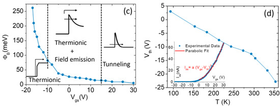 The gate voltage that corresponds to is identified by the change of slope in the plot at lower . The corresponding to is the so-called Schottky barrier height at the flat-band (or simply Schottky barrier). From the plot in Figure 5c, its value is , confirming the presence of a barrier at the Ni-contacts, inferred from the asymmetric output characteristics of Figure 2.