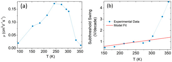 Temperature dependence of (a) mobility per unit voltage and (b) subthreshold swing.