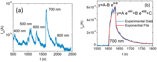 (a) Drain-source current measured under 30 s laser pulses at different wavelengths (, ). (b) Photocurrent generated by a laser pulse at the wavelength of and optical power with exponential fits.