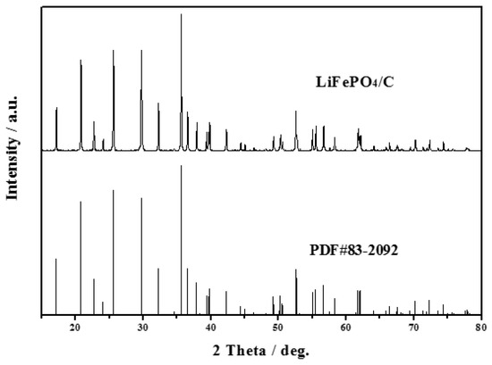 The XRD pattern of LiFePO4/C composite is shown in Figure 1. It can be observed in Figure 1 that the sample displays a pure phase with an ordered olivine structure indexed to the orthorhombic Pnmb (PDF#83-2092). No extra diffraction peaks of carbon are found, suggesting that the residual carbon is amorphous and does not affect the structure of LiFePO4 [27,28,29,30]. Besides, all the diffraction peaks are narrow and sharp, indicating that the LiFePO4/C composite exhibits a high degree of crystallinity.