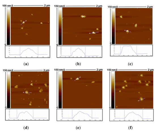 AFM was also used to investigate the morphology of CMACPs. As shown in Figure 3a, the bottom diameter of CUR loaded MAPs was ~150 nm and increased layer by layer, reaching a maximum of ~200 nm for 9 layers (Figure 3f), which is in agreement with the size tendency analysed by NTA, as shown in Figure 1b. However, rougher surface morphology was observed for CMACPs compared to MACPs, as shown in Figure 2. CUR is known as a highly hydrophobic drug [68,69,70] and the loading of CUR into MACPs increased the hydrophobicity of the particles. This meant that the particles rapidly dehydrated during AFM analysis and exhibited rough surfaces, indicating the successful loading of CUR into MACPs.