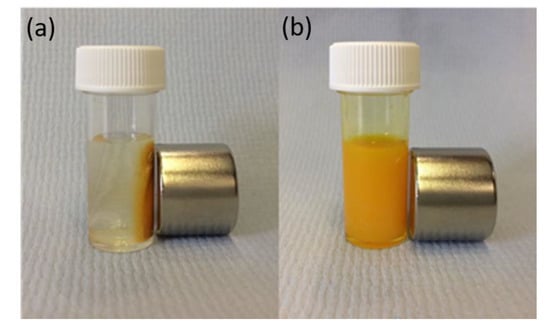 CUR loaded MACPs were prepared by dispersing MACPs in CUR water/DMSO solution and incubated under stirring for 24 h. The addition of DMSO increases CUR solubility and its permeability into MACPs. The volume ratio of water:DMSO was 3:2, resulting in a homogeneous CUR solution (3 mg/mL) without sedimentation during the 24 h of incubation [71]. Figure 4a clearly demonstrates that the resultant CMACPs can be collected with a Neodymium magnet while CUR itself in the bulk solution was not affected by the magnetic field. Therefore, MACPs can be potentially used for targeted delivery of CUR via external magnetic fields.