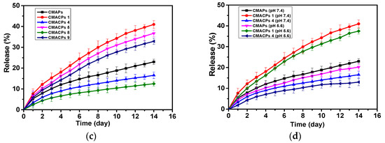 In order to investigate the drug release profile of CMAPs and CMACPs at different pH, CMAPs, CMACPs with 1 and 4 layers were dispersed in PBS with pH 7.4 and pH 5.6. As illustrated in Figure 5d, the release pattern of CUR from particles at pH 5.6 was similar to those at pH 7.4, but slightly slower. In 14 days, about 23%, 41% and 17% of CUR were released from CMAPs, CMACPs 1 and CMACPs 4 at pH 7.4 respectively, while about 20%, 37% and 13% of CUR were released at pH 5.6. The data are in agreement with previously published work by Martins et al. [41] who investigated the release profiles of CUR from N-trimethyl chitosan/alginate complexes at pH 7.4 and pH 1.2 and reported that 80% of CUR was released at pH 7.4 within the first hour while only 22% of CUR was released at pH 1.2. The pH dependent release pattern can be attributed to the altered surface charge and hydrophobicity of polymers at different pH values.