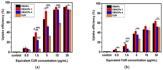 The cells were analysed by flow cytometry to determine the cellular uptake of CUR by different cells. As shown in Figure 6a, it is evident that the percentage of MDA-MB-231 cells taking up CUR was dose dependent. Significant higher uptake efficiency was observed for MDA-MB-231 cells treated with CMAPs and CMACPs than those treated with free CUR, indicating that the nanoparticles facilitate the CUR uptake. This is in agreement with previously reported data [1,17,74,75,76]. Here, at a CUR concentration of 1.5 μg/mL, an uptake efficiency of 31.2%, 39.6% and 24.2% was observed for MDA-MB-231 cells treated with CMAPs, CMACPs 1 and 4 respectively, which is 3–6 fold higher than the uptake efficiency of cells treated with free CUR. The increased CUR uptake of CMAPs can be attributed to the fact that the CUR loaded nanoparticles were more easily taken up by cells via endocytosis, due to their smaller size (172–199 nm), while highly hydrophobic CUR was insoluble in aqueous solutions forming larger aggregates, which are more difficult to be internalised by cells [75,77]. The order of uptake efficiency of free CUR and CUR loaded particles was CMACPs 1 > CMAPs >CMACPs 4 > free CUR. Particles with CHI as the outermost layer exhibited the highest uptake efficiency (39.6%). This result is in agreement with work by Zhou et al. [46], who compared the uptake efficiency of CHI/alginate coated poly (lactide-co-glycolide) nanoparticles and observed the uptake efficiency of particles with CHI as the outermost layer was the highest. The promoted CUR uptake by the CHI surface is because of the protonated amino groups, which interact with the negatively charged cell surfaces and promote the accumulation of CMACPs 1 onto the surface of MDA-MB-231 cells. Figure 6b shows the CUR uptake efficiency for HDF cells after being treated with free CUR and CUR loaded particles. HDF cells exhibited a similar uptake pattern, but an overall much lower CUR uptake efficiency compared to MDA-MB-231 cells, suggesting CMAPs and CMACPs target cancer cells rather than normal cells. This is in agreement with many previously published reports [28,78,79,80] as cancer cells possess a higher metabolic activity than normal cells and their surfaces overexpress various receptors that in turn increase the available binding sites promoting a higher uptake efficiency of particles and drugs [81,82,83].