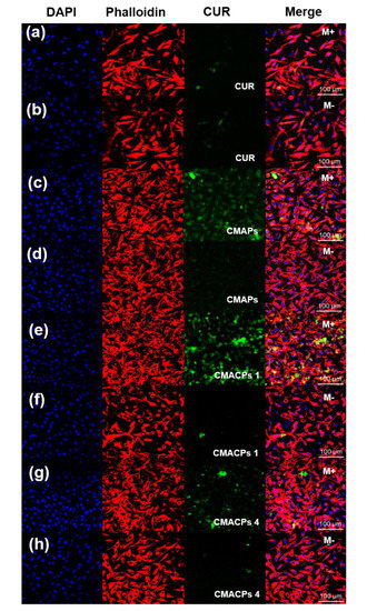 Confocal fluorescence microscopy images of MDA-MB-231 cells incubated with free CUR (a,b), CMAPs (c,d), CMACPs 1 (e,f) and CMACPs 4 (g,h). CMACPs 1 and 4 represent CMACPs that possess 1 and 4 layers of polymers coated on MNPs respectively. CUR loaded particles contained equivalent amount of drug as free CUR (5 μg/mL). Cell nucleus and cytoskeleton were stained with DAPI (blue) and Alexa Fluor 568 Phalloidin (red). M+ denotes the images taken within the magnet affected area and M- denotes the images taken outside of the magnet-affected target area.