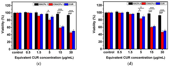 In order to investigate the cytotoxicity of CMACPs towards cancer and normal cells, MDA-MB-231 breast cancer cells and HDF cells were incubated with free CUR, CMACPs 1, CMACPs 4 and blank MACPs for 48 h. The in vitro MTT assay results are shown in Figure 8. It can be observed in Figure 8a,b that both free CUR and CMACPs exhibited increased cytotoxicity towards MDA-MB-231 cells with increasing CUR concentration, which was in agreement with previously reported data that CUR possesses dose dependent cytotoxicity towards cancer cells [1,17,74,75,76]. Both CMACPs 1 and 4 showed enhanced cytotoxicity towards MDA-MB-231 cells compared to free CUR, which can be attributed to an enhanced uptake of CMACPs. As discussed in Section 3.3.1, the uptake efficiency of MDA-MB-231 cells treated with CMACPs was 3–6-fold greater than those treated with free CUR. It is expected that the sustained release of CUR from internalised CMACPs maintained a high CUR concentration within the MDA-MB-231 cells, thus leading to lower viability of cells. CMACPs 1 were observed to exhibit higher cytotoxicity towards MDA-MB-231 cells than CMACPs 4, which was due to a higher CUR release rate (Figure 5c) and uptake efficiency (Figure 6a). As shown in Figure 8c,d, the viability of HDF cells after treatment with free CUR and CMACPs was reduced at higher CUR concentrations (>15 μg/mL), but a high viability was observed in contrast to MDA-MB-231 cancer cells at CUR concentrations below 15 μg/mL. One of the major accepted theories is that cancer cells possess lower glutathione levels than normal cells, due to their reprogrammed metabolic pathways [29]. Depletion of glutathione, which is important for the sensitivity of cells to CUR can lead to the enhancement of CUR sensitivity of cancer cells [29,78,84]. In addition, most cancer cells, but not normal cells, express constitutively active NF-KB that mediates their survival. CUR can suppress NF-κB regulated gene products, thus suppressing the proliferation of cancer cells [78,85]. High viabilities were observed for both MDA-MB-231 cells and HDF cells after they were treated with blank MACPs, demonstrating that MACPs are non-toxic towards these cells.