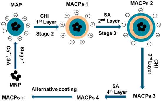 Schematic illustration for the preparation of MAPs and MACPs. MAPs were fabricated by coating cross-linked alginate on MNPs using Ca2+ as the cross-linker. MACPs were prepared by alternatively depositing CHI and sodium alginate (SA) on MAPs based on the electrostatic interaction between the two biopolymers. The alternative coating was repeated until MACPs with desired number of layers were obtained (Stage 2 and 3). MACPs 1, 2, 3, 4 and n represent CMACPs that possess 1, 2, 3, 4 and n layers of polymers coated on MNPs respectively.