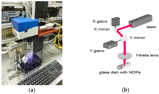 Work station for laser modification of nanodiamond: (a) picture of the system (b) scheme of the scanner head.