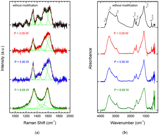 Following the modification process, all the functional groups identified in the unmodified powder were visible in the FT-IR spectra (Figure 2b), although their band positions were shifted to lower wavenumbers. The bands for C=C bonds were substantially more intense after laser modification. This result is consistent with the results of Raman spectroscopy, which showed that graphitization on the surface of the particles occurred at higher average laser powers.