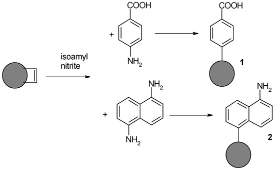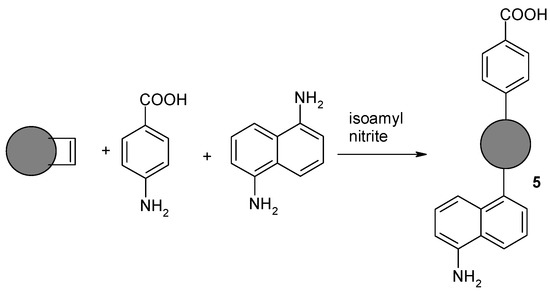Success would allow the simultaneous introduction of structurally differentiated aromatic compounds onto the surface of the carbon nanomaterials. p-aminobenzoic acid and 1,5-diaminonaphthalene were used in the studies. The final product of the reaction was expected to be carbon nanomaterial containing both carboxyl and amine functions, which would allow further selective functionalization of the surfaces of the material (Figure 8).