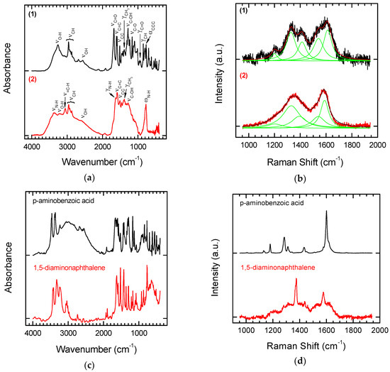 The reaction products were analysed by means of FT-IR and Raman Spectroscopy (see Figure 4a,b). To enable straightforward interpretation of the FT-IR and Raman spectra of Products 1 and 2, the spectra of the starting substrates, p-aminobenzoic acid and 1,5-diaminonaphthalene, were also recorded (Figure 4c,d).