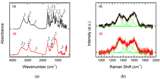 The effect of modification of substrate 1 by methyl ester 6-aminohexanoic acid is not visible in the Raman spectrum (Figure 6b). The spectrum of the final product of chemical modification 3 looks almost the same as that of Substrate 1 and confirms only the presence of the NDPs used as the base for chemical modification.