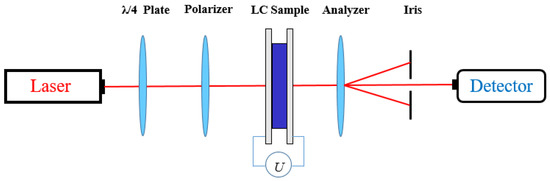 Figure 1 depicts the measurement setup of the dynamic response. The absorption axes of the polarizer and the analyzer were placed orthogonally on opposite sides of the LC cell. Impulse voltage with a time of 1 s and an amplitude of 2 V was applied to the PAN cell. When applying or withdrawing voltage occurred, the changes in the intensity of a laser beam (632.8 nm) that passed through the PAN cell were monitored by a detector that is connected to the oscilloscope (Tektronix MDO3024, Johnston, OH, USA). Meanwhile, the rise time and decay time were obtained directly from the oscilloscope. The temperature was controlled at 20 °C by a hot stage LTS350 (Linkam, Surrey, UK) to ensure the accuracy of the experiment. According to Reference [37], the rotational viscosity could be calculated by the response time.