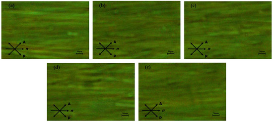 The polarized optical microscope (POM) images of parallel-aligned nematic (PAN) cell with and without γ-Fe2O3 nanoparticles. (a) 0.00 wt%; (b) 0.02 wt%; (c) 0.05 wt%; (d) 0.08 wt%; and (e) 0.11 wt%.