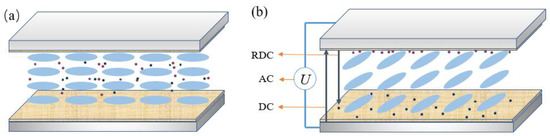 (a) Natural state of liquid crystal (LC) molecules and ionic impurities in the PAN cell. (b) Distribution of LC molecules and ionic impurities under applied voltage in the PAN cell.