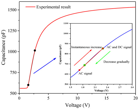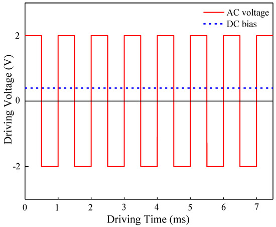 As shown in Figure 4, the LC cell could be regarded as a capacitor whose capacitance value changes with the rotation of LC molecules under an applied electric field. For positive LC materials, the voltage and capacitance in the area where the capacitance value increases substantially with voltage almost presents a linear relationship. The waveform was applied, as illustrated in Figure 5, to simulate the actual driving signal. Results show that the effective voltage on the LC layer increases and the initial capacitance changes instantaneously and reaches the maximum value when the DC voltage is applied to the LC cell under the action of a certain AC signal. Meanwhile, the impurity of ions in the LC cell would produce a directional drift. The positive and negative ions would gradually accumulate on the alignment layers on both sides of the glass substrate over time. With ion aggregation, a gradually increasing internal electric field would be formed, and the external DC electric field is offset continuously, resulting in a gradual decrease in the capacitance value of the LC cell and the corresponding voltage is the residual DC voltage.