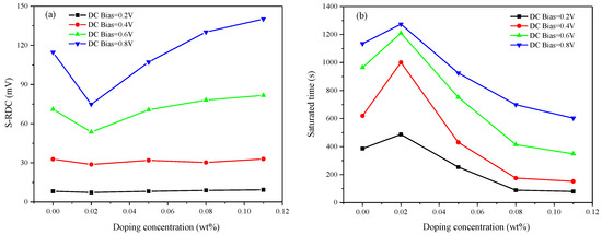 (a) Saturated residual DC voltage of different concentrations at different DC bias voltages. (b) Saturated time of different concentrations at different DC bias voltages.