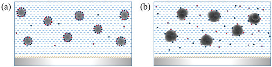 The second mechanism explaining the saturated residual DC voltage is the interface characteristics of nanomaterials. When doping at low concentrations, the interaction between the nanoparticles could be neglected. Given their large specific surface area and surface binding energy, γ-Fe2O3 nanoparticles adsorb a large proportion of the impurity ions in the LC cell and stably combine together, as illustrated in Figure 8a. With the increase in doping concentration, the interaction between nanoparticles in the LC system gradually increases, leading to the agglomeration of neighboring nanoparticles. Therefore, particle size increases with increasing doping concentration. The increase in the particle size of nanoparticles could rapidly reduce their specific surface area and surface binding, thereby weakening their surface adsorption capacity and enlarging the quantity of free ions dispersed in the LC cell (Figure 8b). Consequently, the saturated residual DC voltage would decrease to a certain value and then increase as the concentration of the nanoparticles increases. The experimental results in Figure 7 are in good agreement.