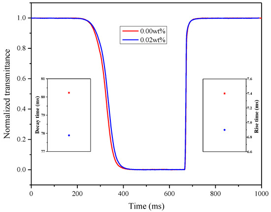 The response time should also be considered to improve the image quality by using LC doped with nanoparticles. Prolonging the response time results in tailing and even other undesirable phenomena when switching the picture being displayed. The dynamic response of pure LC and the doping concentration of 0.02 wt% are described in Figure 9. Similar to the results discussed in the article in Reference [21], the rise and decay times of the LC doped with nanoparticles are uniformly increased by 10%. Therefore, the incorporation of 0.02 wt% γ-Fe2O3 nanoparticles into the LC material could not only reduce the residual DC voltage to a certain extent, but also accelerate the response time, which could be used to improve the image quality ingeniously.