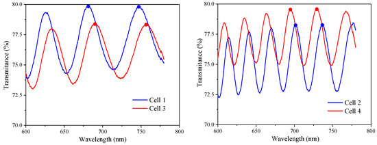 Wavelength-transmittance (λ-T) curves of four types of LC cells.