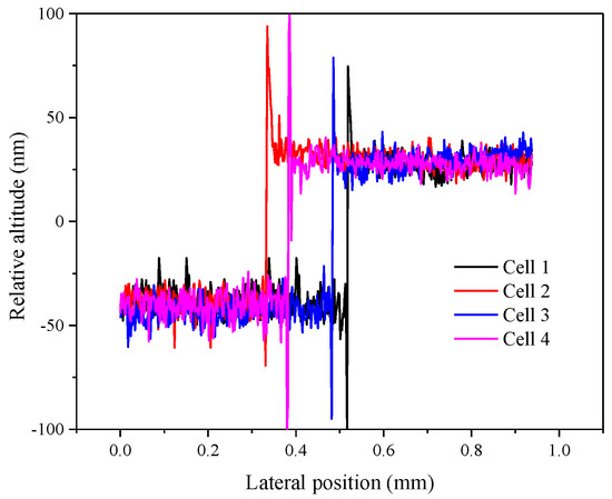 In the previous part, we mainly studied the residual and response characteristics of LC materials doped with γ-Fe2O3 nanoparticles. In addition, the alignment layer was considered to be a major factor causing image sticking. Hence, we continued to discuss the influence of friction torque difference between two alignment layers in the LC cell on the residual characteristics, where the friction torque represents the different rubbing strengths on the upper and lower substrates. The thickness values of the LC cells are shown in Figure 10, and the dots marked on each curve are the reference points used to calculate the thickness. As shown in Figure 11, the nearly reddish region shown in the 3D morphology is the polyimide (PI) layer coated on the substrate. Figure 11 and Figure 12 revealed that alignment layers were spin-coated uniformly and smoothly. The thickness difference is very subtle, about 60 nm, and the cause of relative altitude mutation is the residue when alignment layers were removed after high temperature heating. The same PI materials were used in the four types of LC cells. Thus, the effect of the material and thickness of the alignment layers on the result could be ignored.
