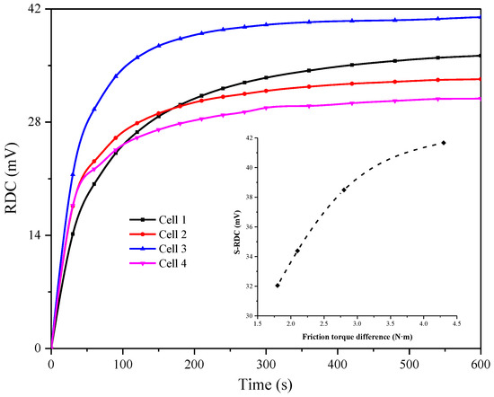 Variation in residual DC voltage with time, in which the inserted graph shows the relation between saturated residual DC voltage and friction torque difference.