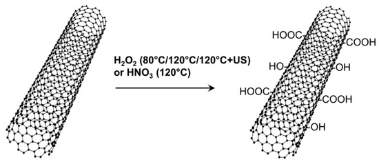 - Rosca, I.D.; Watari, F.; Uo, M.; Akasaka, T. Oxidation of multiwalled carbon nanotubes by nitric acid. Carbon 2005, 43, 3124–3131. [Google Scholar] [CrossRef]
