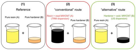 Carbon fiber reinforced composites (CFRP) were prepared using a plain weave with an areal weight of 245 g/m² and a yarn fineness of 200 tex (3k) warp/weft from high tenacity (HT) carbon fibers (SGL CARBON SE, Wiesbaden, Germany). The CFRP was cured in a heated press at 140 °C for 1 h at 30 bar. Plates with a final thickness of 4 mm were produced using 20 layers of plain weave. Three different mixes for the production of CFRP plates were prepared (Figure 3): a reference that contains no CNT (1), a “conventional” route, using a dispersion of neat MWCNT/epoxy from the TRM (2) and the “alternative” route, using ultrasonic dispersion of oxidized MWCNT in hardener (3).