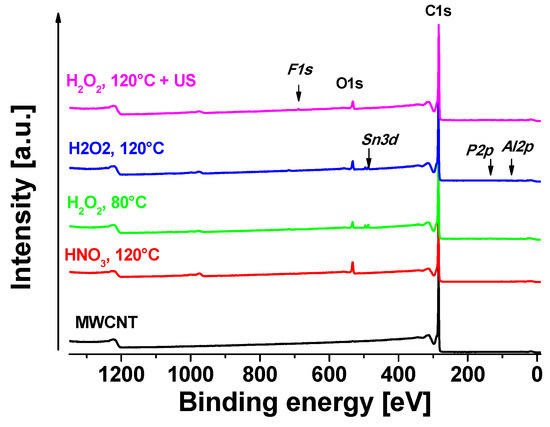 All oxidative treated MWCNT samples were analyzed by XPS in order to compare resulting oxidation degrees. The neat MWCNT were used as reference to oxidized samples. Figure 4 shows the XPS survey of all studied samples. One oxidation strategy was based on H2O2 at different temperatures (80 °C/120 °C). A separated batch was first oxidized at 120 °C and additionally treated in H2O2 solution under sonication at room temperature (120 °C + US). In the second approach, HNO3 was used as oxidant, which is a well-established method [10,40,44,45].