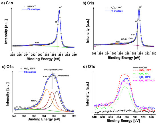 Apparent surface chemical compositions of studied samples are summarized in Table 2. Neat MWCNT only show a negligible amount of oxygen on the surface of about 0.1 at%. C1s signal of neat MWCNT exhibits strong asymmetry because of the sp2 peak and the presence of delocalized π-electrons (conduction electrons), available for shake-up like events following core electron photoemission [46]. As was mentioned in the experimental section, we have identified these asymmetry parameters during fitting of neat MWCNT and we used them for fitting of sp2 signal for all samples. C1s fit of neat MWCNT sample is shown in Figure 5a and the associated quantification is displayed in Table 2. For oxidized samples, signals of sp2 carbon (centered at ~284.4 eV), sp3 carbon (~285.0 eV), C–O (~286.4 eV), C=O (~287.1 eV), OC=O (~ 289.2 eV), and π–π* shake-up (~291.2 eV) were detected. The highest oxygen content (~8.5 at%) was detected in the case of MWCNT treated with HNO3 at 120 °C. In this case, a certain amount of sp3 carbon was also present, indicating some defects in sp2. In the case of H2O2 at 80 °C treatment, the oxygen content was the lowest ca. 3.2 at%. At higher temperature of 120 °C the oxygen content was slightly higher ca. 4.7 at% (sample H2O2, 120 °C). After ultrasonication of the H2O2, 120 °C sample, the oxygen slightly decreased to 4.3 at%, which can be consequence of some cleaning of the surface by this procedure, but the decrease is only marginal and practically within the accuracy of XPS (ca. ±10% of particular signal). The chemistry of oxygen species is similar in all cases of oxidized samples, where carbonyls (C=O at ~531.6 eV), carboxyls/esters (OC=O at ~532.5 eV), hydroxyls/ethers (C–O at ~533.5 eV) and some more complicated structures such as O2C=O at ~534.8 eV were detected [47]. In the case of the H2O2-treated samples, there was no sp3 carbon fitted, indicating very low amount of defects in sp2 structure.