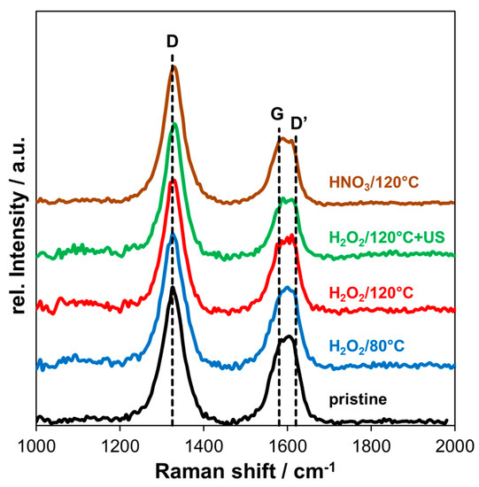 Covalent functionalization of graphitic structure corresponds to an increase in defect density due to the generation of sp3 carbon. Hence, the ratio between intensity of the D band and the G band (ID/IG) was used to indicate structural damage by the oxidation. For pristine MWCNT, the ratio ID/IG was 1.61, increasing to 1.72 and 1.81 for H2O2 oxidation at 80 °C and 120 °C, respectively. After applying additional ultrasonic treatment in H2O2 after oxidation the ratio increased to 2.21 and the oxidation with HNO3 at 120 °C led to an ID/IG ratio of 2.08.