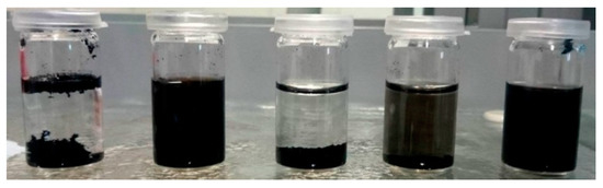 Dispersion of different CNT in water (from left to right): neat MWCNT, oxidized MWCNT in HNO3 (120 °C), H2O2 (80 °C), H2O2 (120 °C), and H2O2 (120 °C + US treatment), respectively.